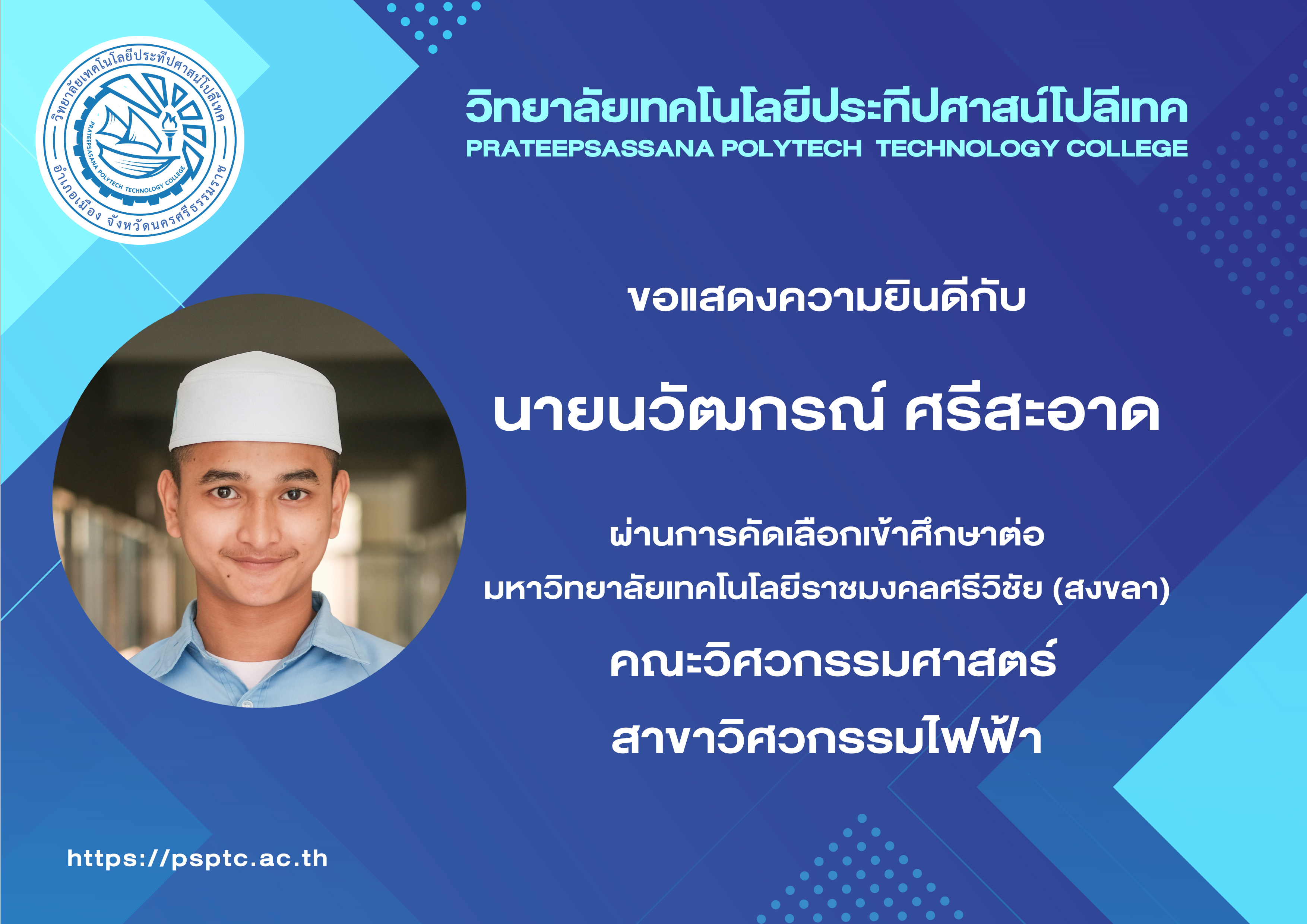- นวัฒกรณ์ ศรีสะอาด มหาวิทยาลัยราชมงคลศรีวิชัย (สงขลา) วิศวกรรมไฟฟ้า
