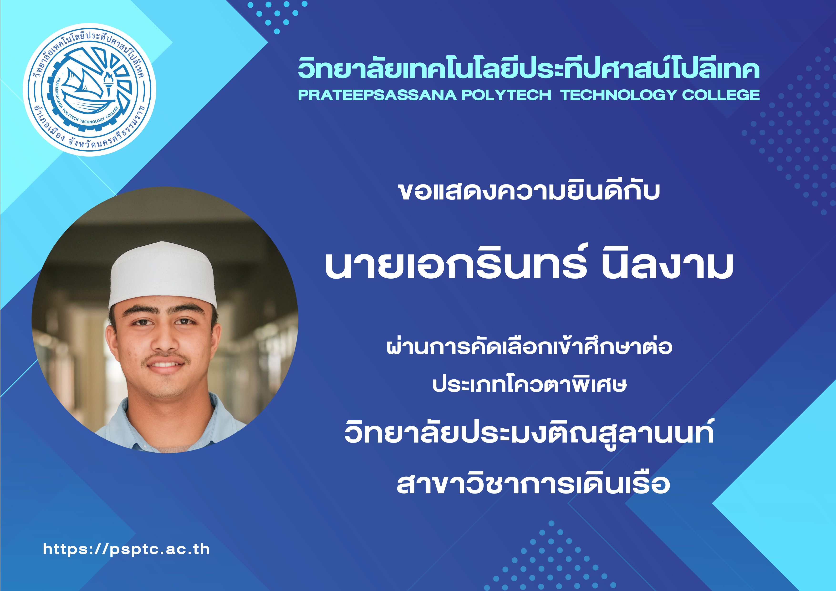 - เอกรินทร์ นิลงาม วิทยาลัยประมงติณสูลานนท์ การเดินเรือ (พาณิชย์ นาวี)