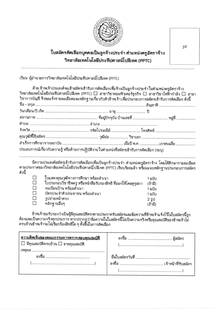 เปิดรับคัดเลือกบุคลคลเพื่อเป็นลูกจ้างประจำ ตำแหน่งครูอัตราจ้าง จึงประกาศรับสมัครบุคคลเพื่อจ้างเป็นลูกจ้างประจำ ตำแหน่งครูอัตราจ้าง วิทยาลัยเทคโนโลยีประทีปศาสน์โปลีเทค (PPTC) โดยมีรายละเอียดดังนี้