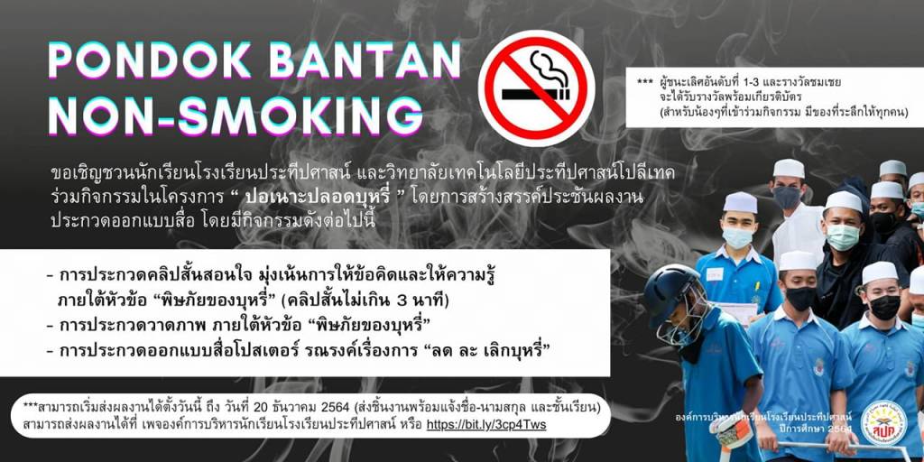 PONDOK BANTAN NON-SMOKING ขอเชิญชวนนักเรียนโรงเรียนประทีปศาสน์ และวิทยาลัยเทคโนโลยีประทีปศาสน์โปลีเทค ร่วมกิจกรรมในโครงการ “ปอเนาะปลอดบุหรี่” โดยการสร้างสรรค์ประชันผลงาน ประกวดออกแบบสื่อ โดยมีกิจกรรมดังต่อไปนี้