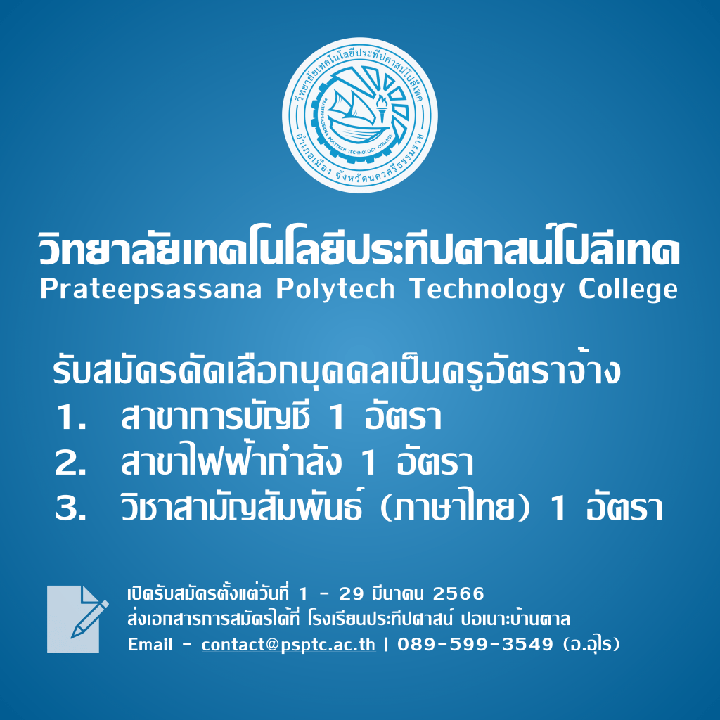 วิทยาลัยเทคโนโลยีประทีปศาสน์โปลีเทค (PPTC) เปิดรับสมัครคัดเลือกบุคคลเป็นลูกจ้างประจำ ตำแหน่งครูอัตราจ้าง จำนวน 3 ตำอัตรา ดังนี้ 1. ครูสาขาการบัญชี 2. ครูสาขาไฟฟ้ากำลัง 3. ครูวิชาสามัญสัมพันธ์ (เอกภาษาไทย) จ้างเป็นลูกจ้างประจำ ตำแหน่งครูอัตราจ้าง วิทยาลัยเทคโนโลยีประทีปศาสน์โปลีเทค (PPTC) โดยมีคุณสมบัติ และวุฒิการศึกษาดังรายละเอียดในลิงก์ด้านล่าง