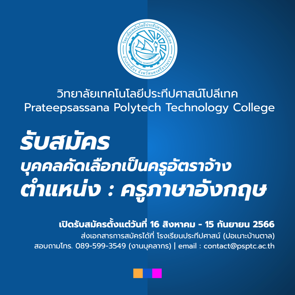 ครูวิชาสามัญสัมพันธ์ (เอกภาษอังกฤษ) จ้างเป็นลูกจ้างประจำ ตำแหน่งครูอัตราจ้าง วิทยาลัยเทคโนโลยีประทีปศาสน์โปลีเทค (PPTC) โดยมีคุณสมบัติ และวุฒิการศึกษาดังรายละเอียดในลิงก์ด้านล่าง