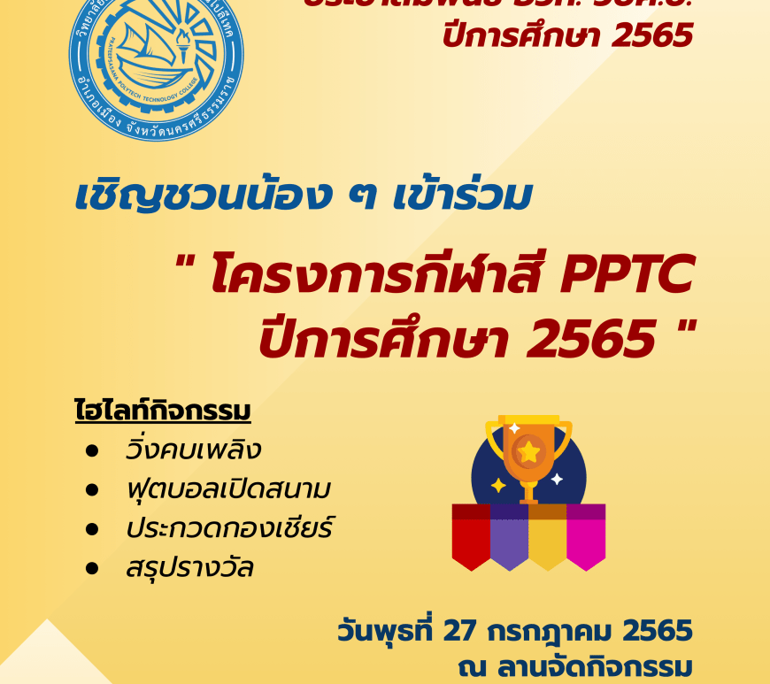 โครงการกีฬาสี PPTC ปีการศึกษา 2565 อ่านเพิ่มเติม ประชาสัมพันธ์กิจกรรมการแข่งขันกีฬาสี PPTC ปีการศึกษา 2565