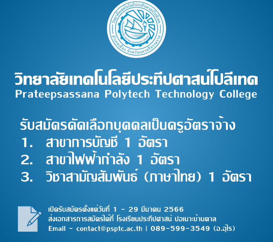 วิทยาลัยเทคโนโลยีประทีปศาสน์โปลีเทค (PPTC) เปิดรับสมัครคัดเลือกบุ … อ่านเพิ่มเติม (ปิดรับสมัคร) ประกาศรับสมัครคครูผู้สอน ปีการศึกษา 2566